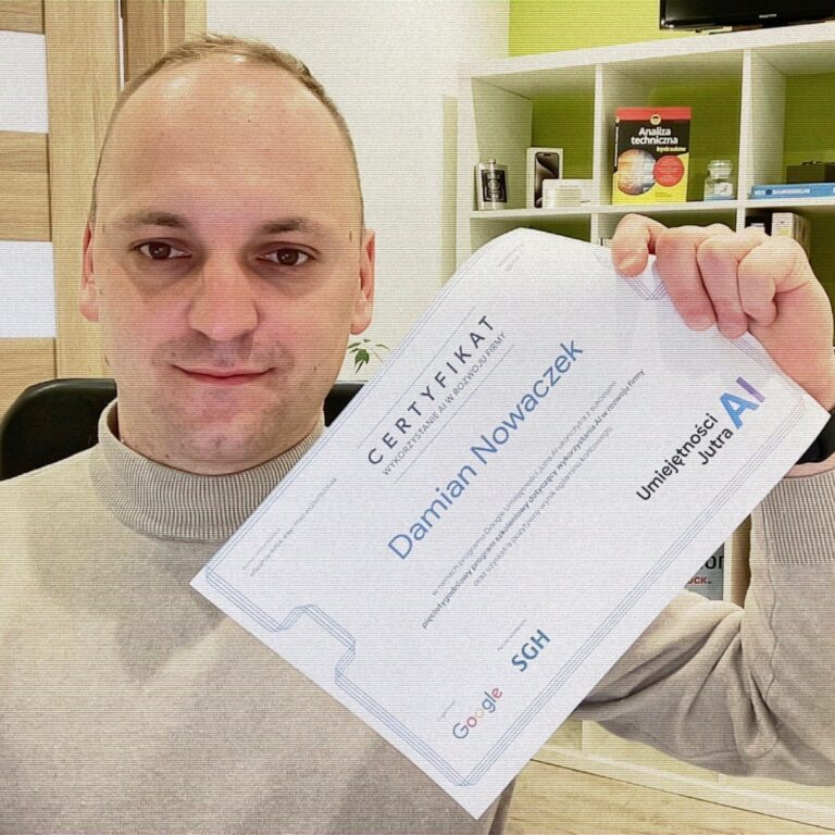 Ukończyłem 5 tygodniowe szkolenia Umiejętności Jutra wspierana przez Google w narzędziach AI. Mogę pomóc Twojej firmie w optymalizacji.