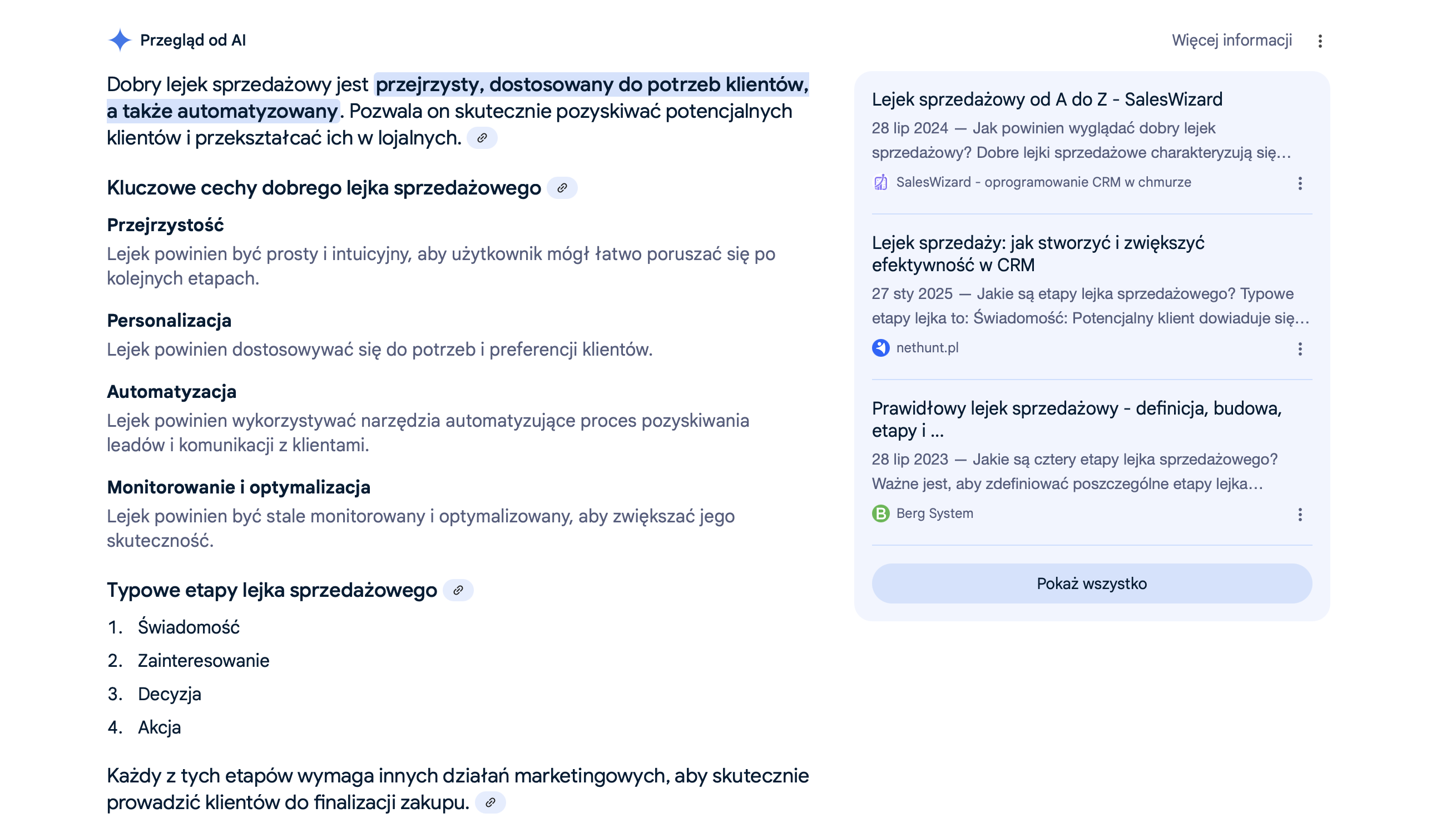 Choć klikalność tych linków może być niższa niż tradycyjnych wyników organicznych, to jednak widoczność w tym miejscu buduje świadomość marki i postrzeganie jej jako eksperta w danej dziedzinie. To forma rekomendacji od samego Google. Pytanie brzmi, jak tę nową formę widoczności przekuć na realne korzyści biznesowe – być może poprzez budowanie długoterminowego zaufania i autorytetu, które zaowocują w inny sposób niż bezpośrednie kliknięcia.