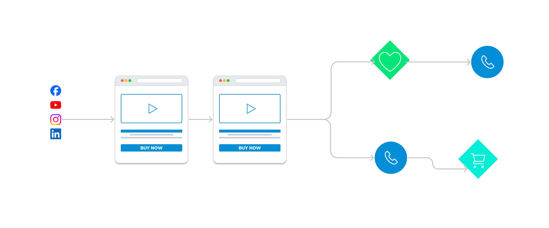 Poniżej przykład już bardziej zaawansowanego lejka dla mojego klienta, mamy tutaj kilka platform i działań.