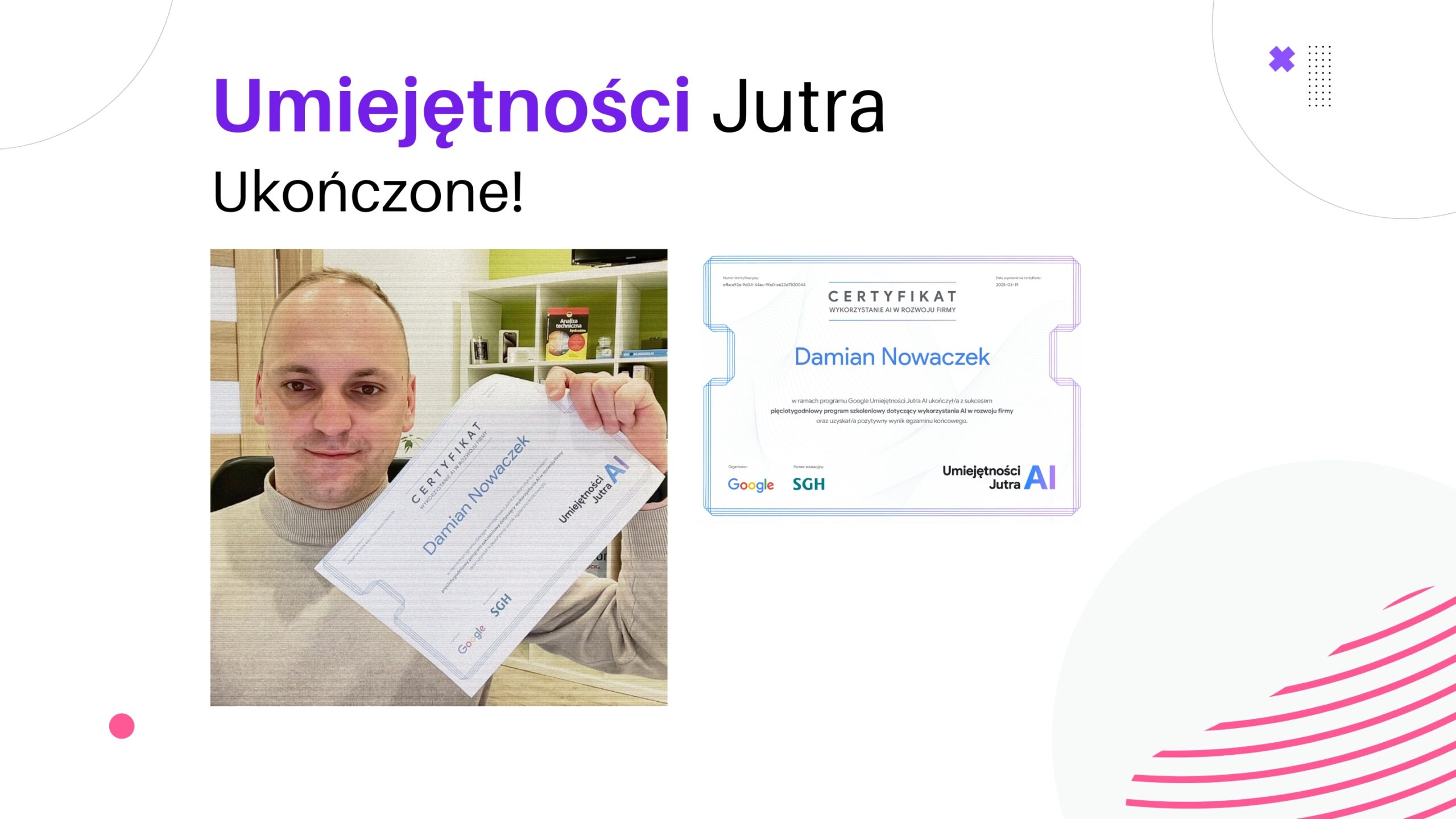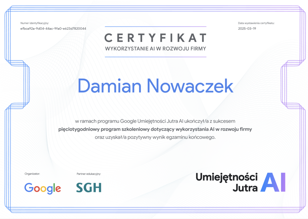 Efekt końcowy? Satysfakcja i namacalny dowód zdobytych umiejętności – certyfikat od Google. Ale to nie sam dokument jest najważniejszy. Najcenniejsza jest nowa perspektywa, świadomość możliwości, jakie daje sztuczna inteligencja, i konkretne narzędzia, które już teraz wdrażam w swojej firmie. Czuję, że zyskałem przewagę i jestem lepiej przygotowany na wyzwania jutra.